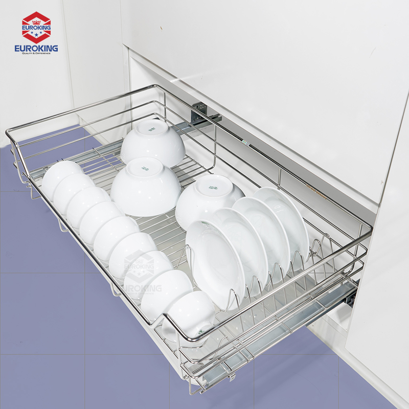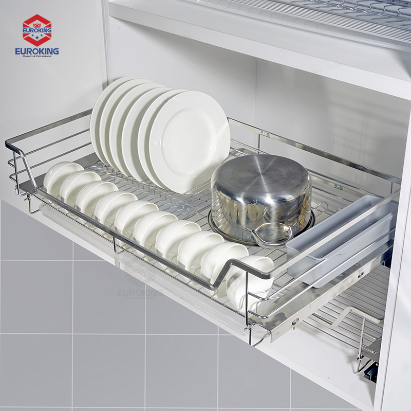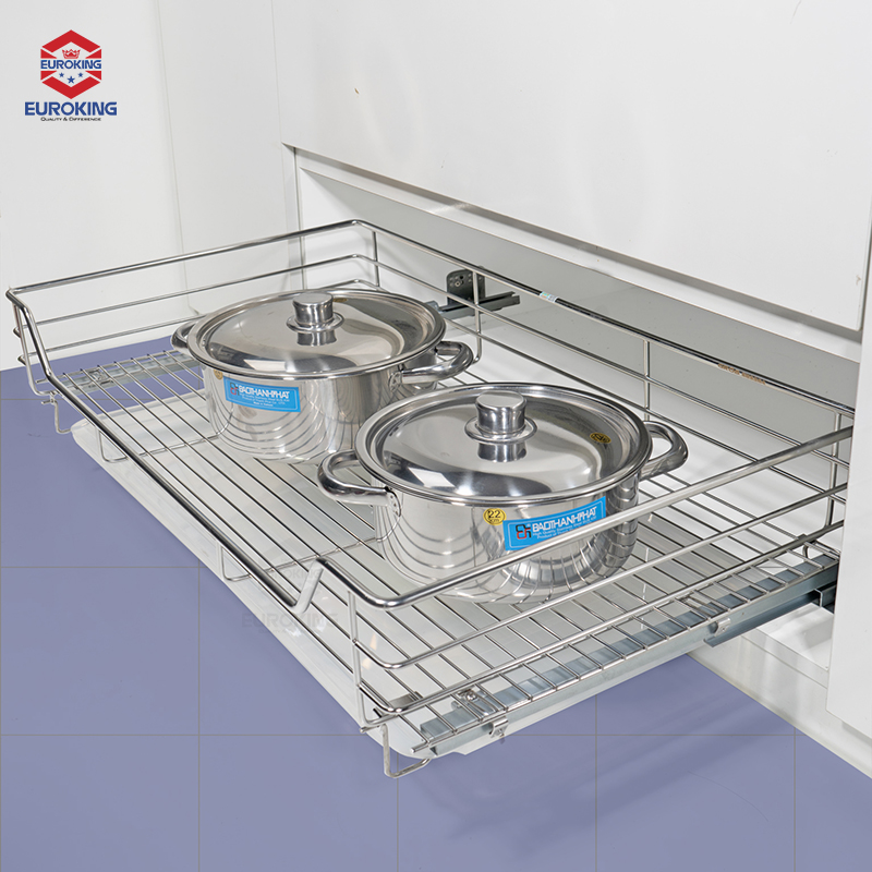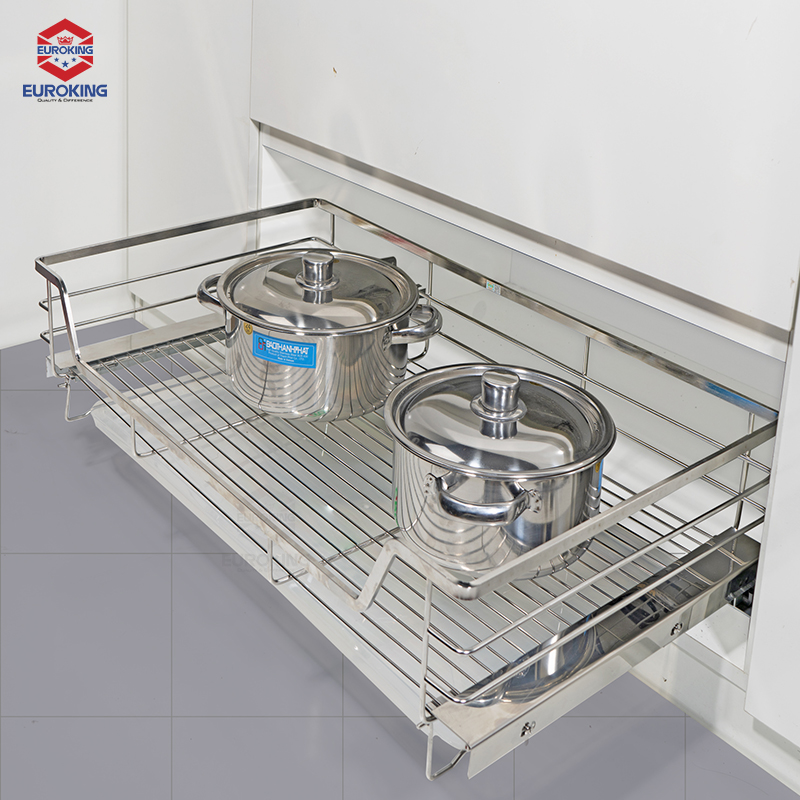 - Cấu tạo: Gồm 1 bộ rổ inox, 1 bộ ray chuyển động, 1 bộ ốc lắp đặt, 1 bộ bắt cánh và 1 khay nhựa hứng nước cao cấp.